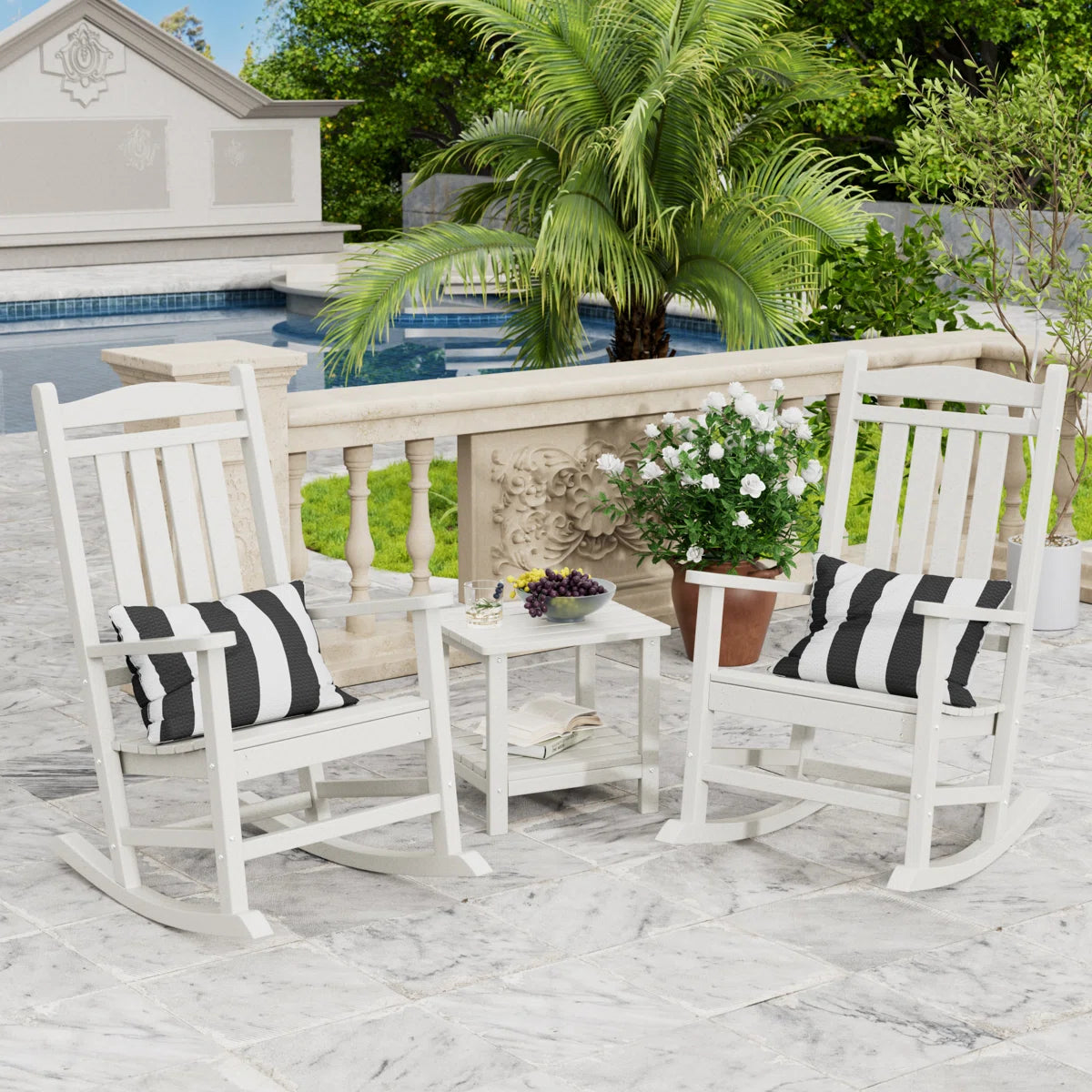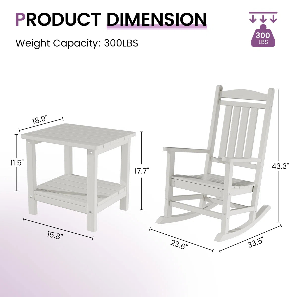 Elevate your outdoor space with our Premium Rocking Chair Set. Picture yourself relaxing in these ergonomically designed chairs, where the spacious backrest and curved armrests provide exceptional comfort as you enjoy the gentle rocking motion. Crafted from durable HDPE material, these chairs withstand all weather conditions, plus, their fire-resistant and UV-resistant properties ensure they stay beautiful and safe year after year. With a stable base and a weight capacity of 300lbs, you’ll find these chairs both sturdy and reliable. Available in sleek black, gray, and white, they seamlessly enhance any patio or garden with modern elegance. Transform your outdoor moments into pure relaxation and style with these exquisite rocking chairs.