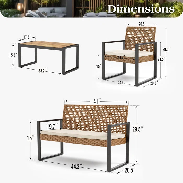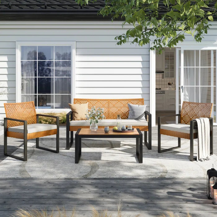 This 4-piece patio set brings a warm and sophisticated vibe to your outdoor space. It includes a loveseat, two chairs, a table, and cushions, and it offers seating for four, making it ideal for enjoying the fresh air with friends and family. The steel frames with sled legs are paired with woven wicker in a cheerful shade, and the intricate diamond-patterned cutout design on the chair backs adds breezy appeal to your al fresco space. We love how the acacia wood table top complements the matte black frame. Each cushion is covered in fade-resistant, stain-resistant, and UV-resistant polyester blend fabric, with machine-washable covers for easy care. Relax and unwind in style with this inviting patio set.