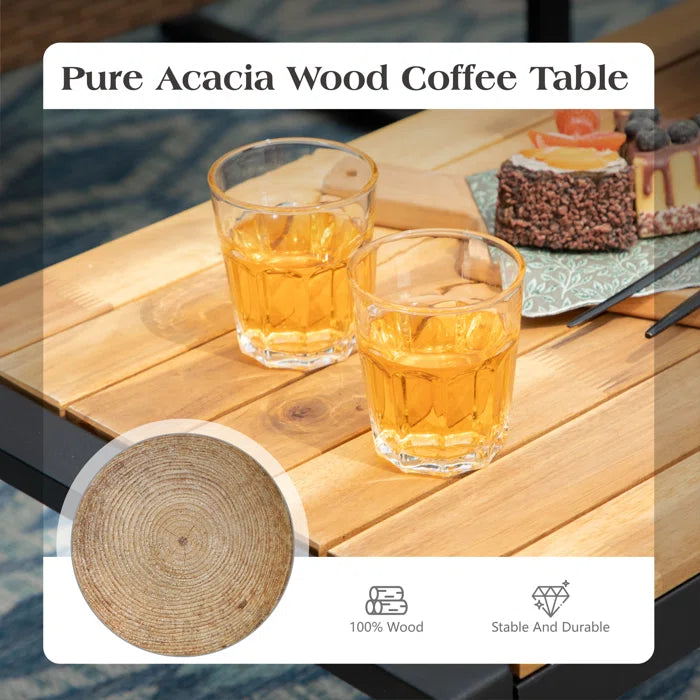 - Acacia wood coffee table enhances the patio with eco-friendly warmth