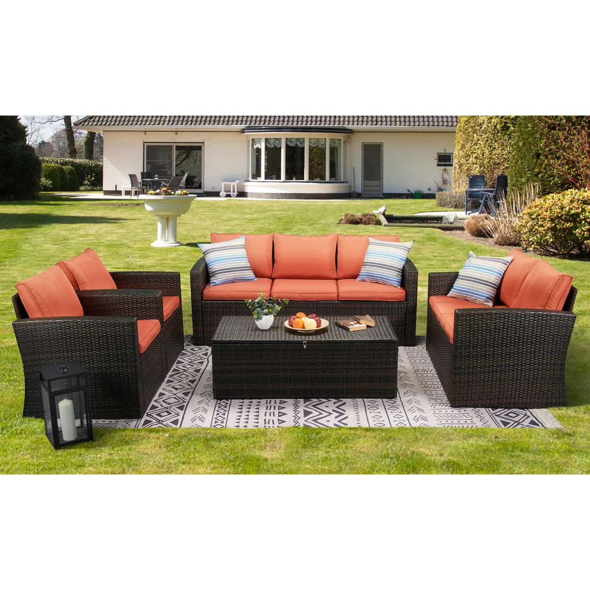 Get ready to entertain in style with this modern 5-piece seating group. It includes a sofa, two chairs, a loveseat, and a table, so there's plenty of seating for up to seven people. Each piece is made with a breezy, wicker-wrapped frame for a coastal feel. We love that the coffee table has a built-in storage compartment: Just lift up the tabletop and tuck away pool towels, books, and other entertaining essentials. Plus, the padded cushions come with machine-washable covers, making cleaning up after a spill or mess a breeze. Finally, this seating group is waterproof and weather-resistant, so it's ideal for keeping outside on your porch or patio.