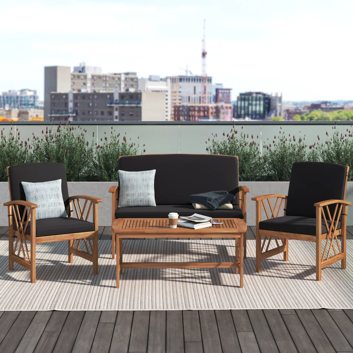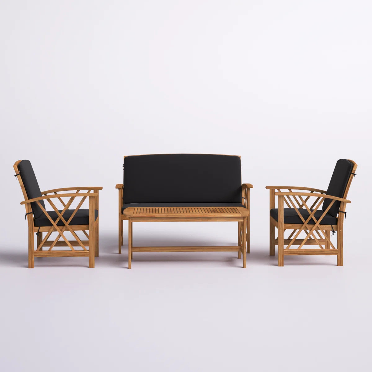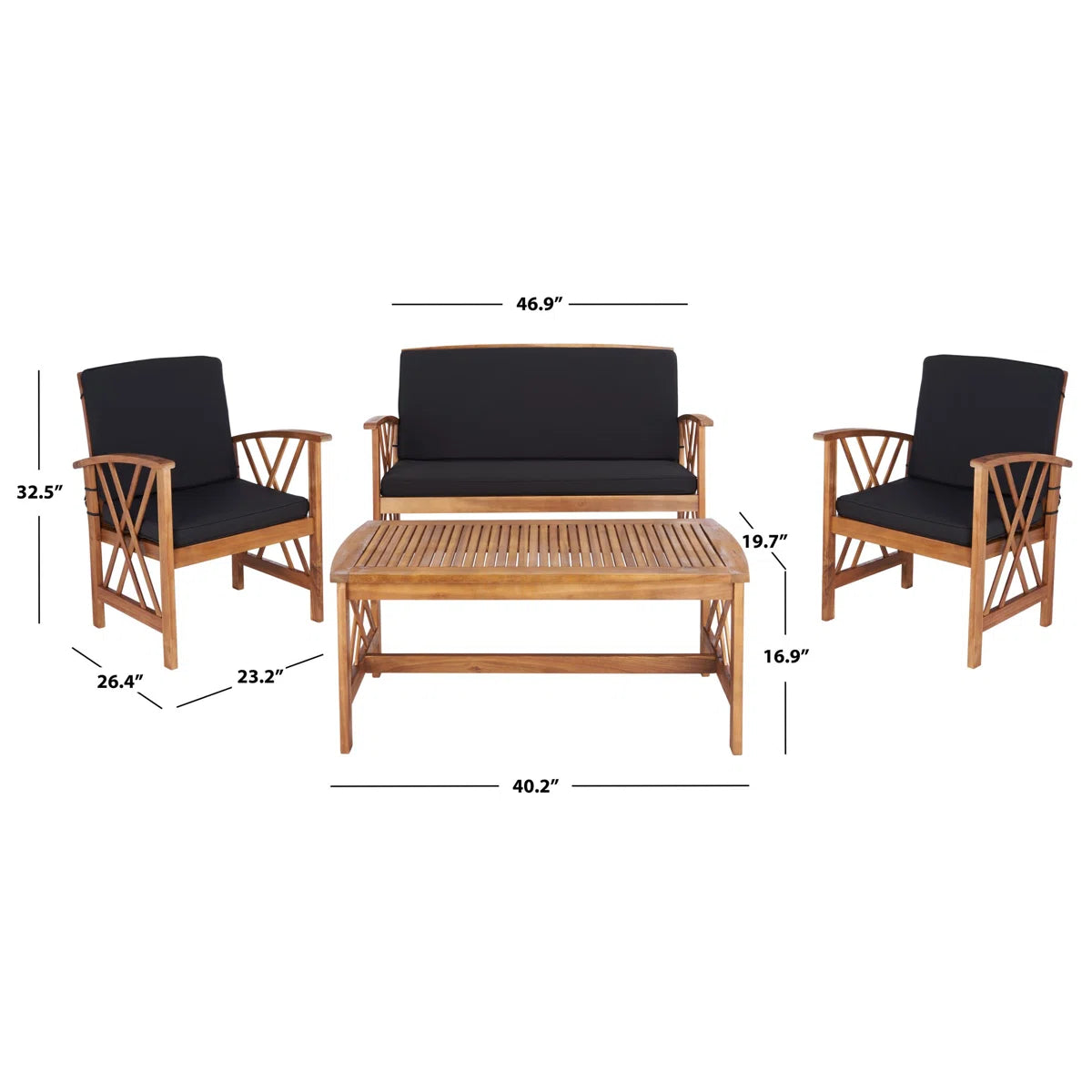 This 4-piece outdoor seating group creates a stylish, coastal space for bubbly drinks and conversation. It includes one loveseat, two armchairs, and one coffee table, all with frames crafted from solid acacia wood in an organic brown hue – with a finish that brings out the natural wood grain color and pattern variation. We love that this set comes with all the necessary cushions and that they have removable polyester cushion covers for easy cleaning. The cushions attach with cushion ties and have zipper closures.
